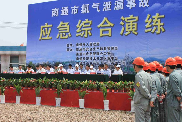 6月21日上午,9時40分,江山股份氯氣站一輛裝有20噸液氯的槽罐車在接卸液氯作業(yè)時,管道“發(fā)生”氯氣泄漏,氯氣向周邊擴散,影響了附近企業(yè)和居民的人身安全……這是南通市氯氣泄漏事故應急綜合演練中的一幕。 由市政府主辦、江山股份承辦的南通市氯氣泄漏事故應急綜合演練是2012年南通市安全生產(chǎn)月的“重頭戲”, 此次應急演練重在提高政府、職能部門、企業(yè)應對危險化學品事故的應急處置能力,最大限度減少因安全生產(chǎn)事故給企業(yè)和人民群眾造成的財產(chǎn)損失和人員傷亡。 由于氯氣是具有刺激性氣味的有毒氣體,可以溶解于水,因此應急處理主要是通過噴灑形成水霧的方法來降低氯氣濃度,控制擴散范圍?,F(xiàn)場用紅色煙霧代替黃綠色氯氣。演練中,市安監(jiān)、公安、消防、環(huán)保、質監(jiān)、衛(wèi)生、氣象等部門積極聯(lián)動,各司其職,氣象部門提供風力、溫度、濕度等實時數(shù)據(jù),環(huán)保部門負責空氣中氯氣含量檢測,公安負責交通管制和疏散救援……僅用了不到40分鐘即圓滿完成了泄漏源堵漏和周邊企業(yè)及居民的疏散工作,充分展示并檢驗了市政府、職能部門及企業(yè)應對危險化學品事故的應急處置能力。 副市長徐輝擔任現(xiàn)場總指揮,并對演練做了綜合點評。江山股份董事長李大軍觀摩現(xiàn)場演練,總經(jīng)理薛健任現(xiàn)場副指揮。