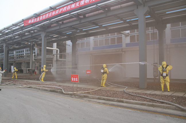 只見(jiàn)噴淋洗消裝置在值長(zhǎng)的指示下及時(shí)開(kāi)啟??傊笓]接到報(bào)告后立即指示啟動(dòng)氯氣泄漏應(yīng)急預(yù)案,并通知公司防護(hù)專業(yè)分隊(duì)至泄漏區(qū)進(jìn)行搶險(xiǎn)救援。隨著現(xiàn)場(chǎng)氯氣的擴(kuò)散,氯堿事業(yè)部的SIS系統(tǒng)自動(dòng)啟動(dòng),液氯泄漏區(qū)的廠房全部自動(dòng)關(guān)閉,氯氣吸收系統(tǒng)自動(dòng)啟動(dòng),將泄漏的氯氣封閉在廠房?jī)?nèi),防止氯氣向外擴(kuò)散。公司對(duì)重大危險(xiǎn)源管控的工程措施在此刻發(fā)揮了重要作用,為應(yīng)急堵漏贏得了時(shí)間。演練中,參演人員各司其職,現(xiàn)場(chǎng)加強(qiáng)警戒進(jìn)行標(biāo)示,及時(shí)疏散人員,快速處置氯氣泄漏,緊急搶救中毒人員,時(shí)刻監(jiān)測(cè)周邊環(huán)境……