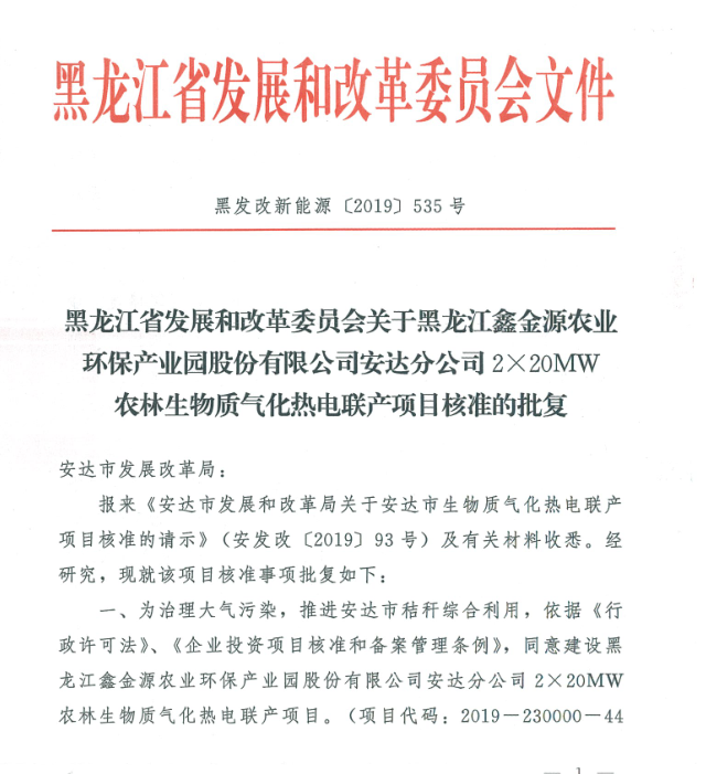 安達2×20MW農(nóng)林生物質(zhì)氣化熱電聯(lián)產(chǎn)項目 獲黑龍江省發(fā)改委核準